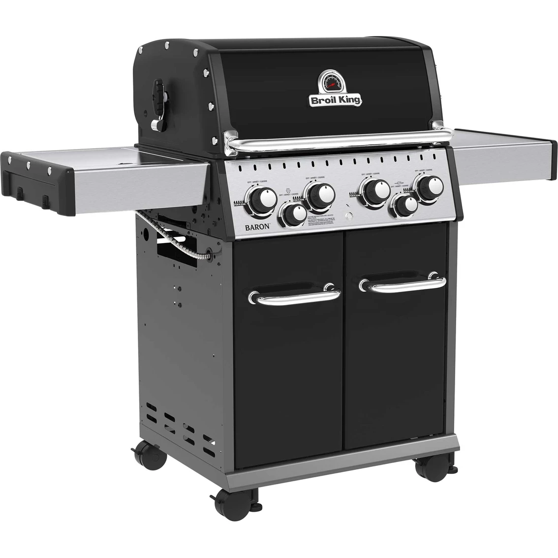 The Broil King Baron 490 features 444 sq. in. primary cooking surface and includes 4 stainless steel Dual-Tube burners, reversible heavy-duty cast iron cooking grids, stainless steel Flav-R-Wave cooking system, and electronic ignition. The 490 features stainless steel drop-down side shelves and enclosed cabinet base.