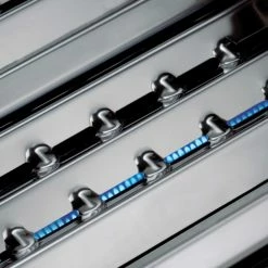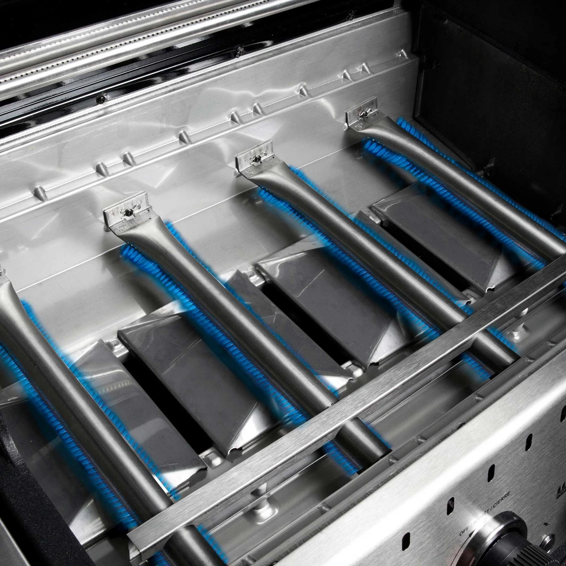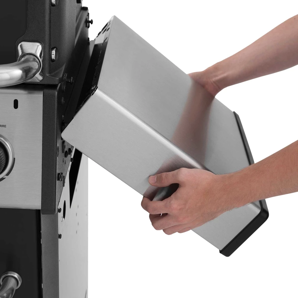 40,000 BTU main burner output. 10,000 BTU professional inset side burner. 15,000 BTU stainless steel rear rotisserie burner and premium rotisserie kit. 644 sq. in. / 4,155 sq. cm. total cooking space including porcelain coated warming rack. 444 sq. in. / 2,865 sq. cm. primary cooking space. Heavy-duty cast iron cooking grids. Linear-Flow valves with 180 degree sensi-touch control. Sure-liteβ’ electronic ignition system. Deluxe Accu-Temp thermometer. Stainless steel cookbox with cast aluminium end caps. Black porcelain enameled hood panel with rugged cast aluminium end caps. Dura-Bilt stainless steel cookbox with cast aluminium end caps. Enclosed cabinet base with black powder coat painted doors. Stainless steel control panel. Stainless steel drop-down side shelves. Heavy-duty locking swivel casters with level setting