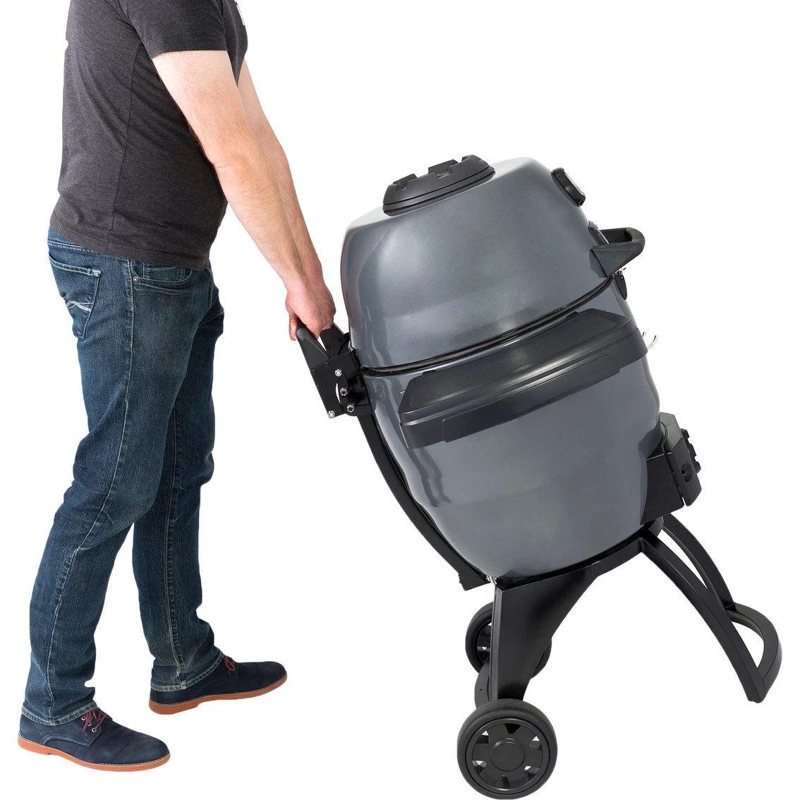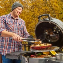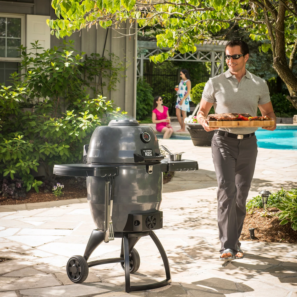 The Broil King Keg 5000 features 480 sq. in. total cooking space, including a chrome coated secondary rack, a heavy-duty cast iron cooking grid, removable ash tray, resin side shelves, a durable steel base and metallic charcoal paint finish.