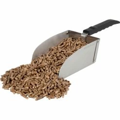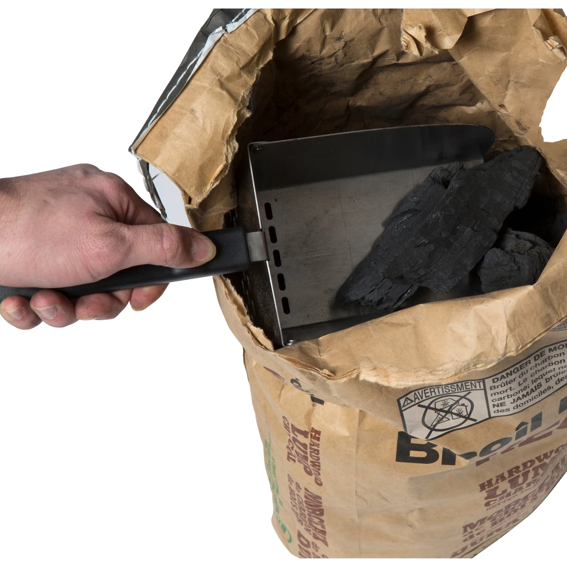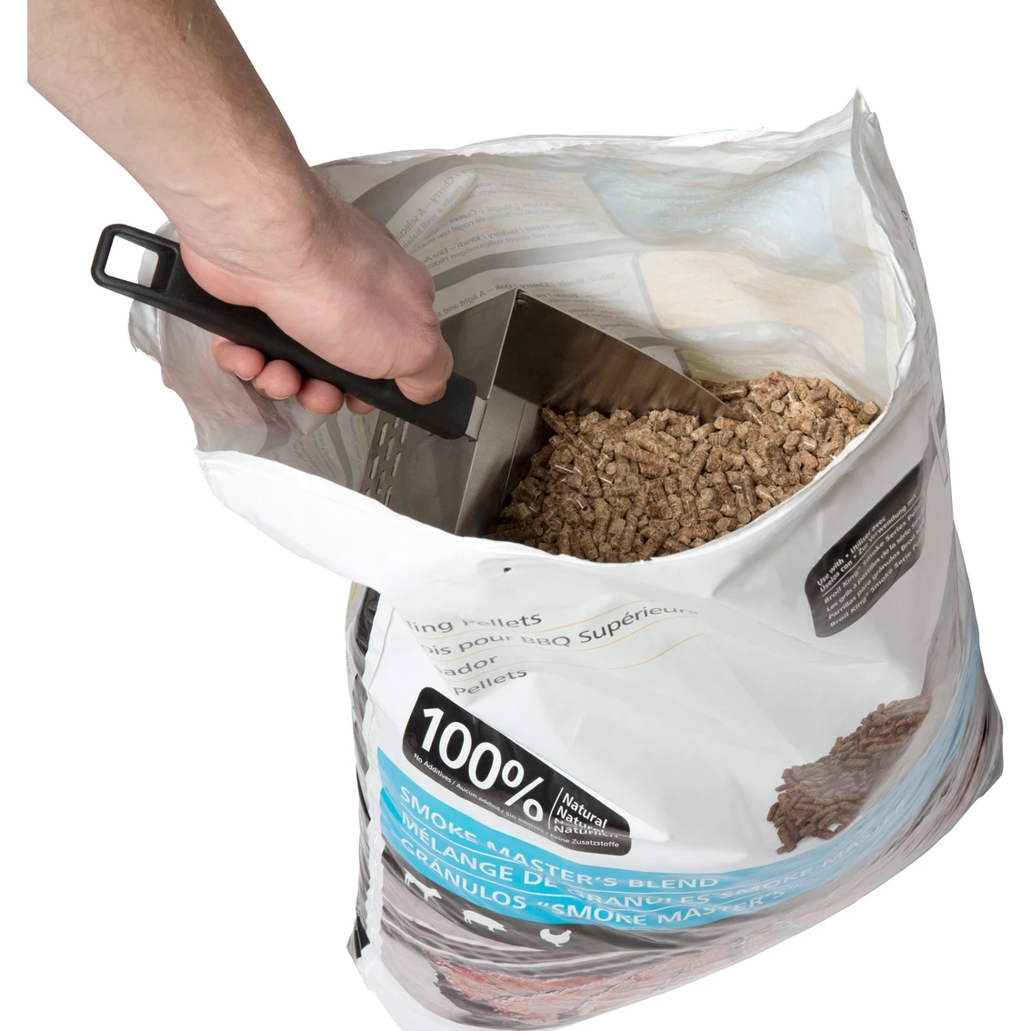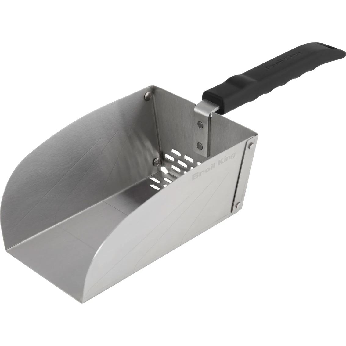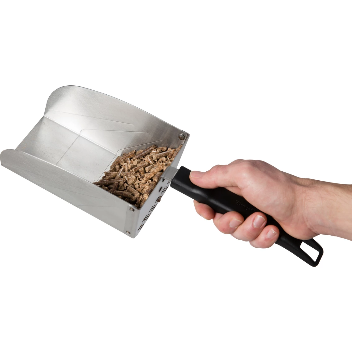 This handy scoop makes adding pellets or charcoal to the grill easy. Integrated sifter removes dust. Graduated scoop base for measuring pellets. Stainless steel scoop with resin handle.