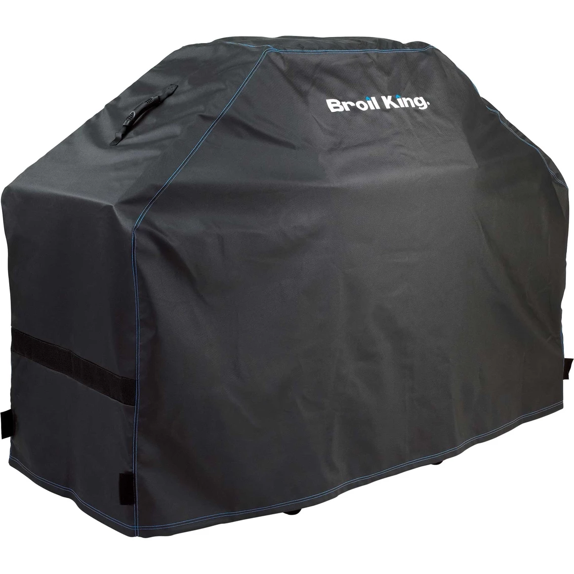 This Broil King premium grill cover is crafted from superior weather resistant PVC with a heavy woven 900D polyester backing. It features mesh venting for better airflow and moisture resistance. The hook and loop closures ensure a superior fit, and blue accent stitching adds style to the reinforced seams. This grill cover is also equipped with molded rubber handles to make it easy to remove. Fits Broil King gas grill models: Baron 400, Crown 90, 10 Post , Signet 70/90, Sovereign 20/70/90 and other brand grills.