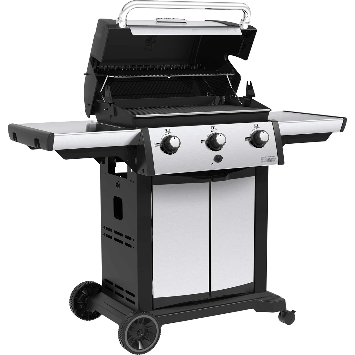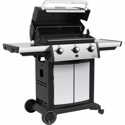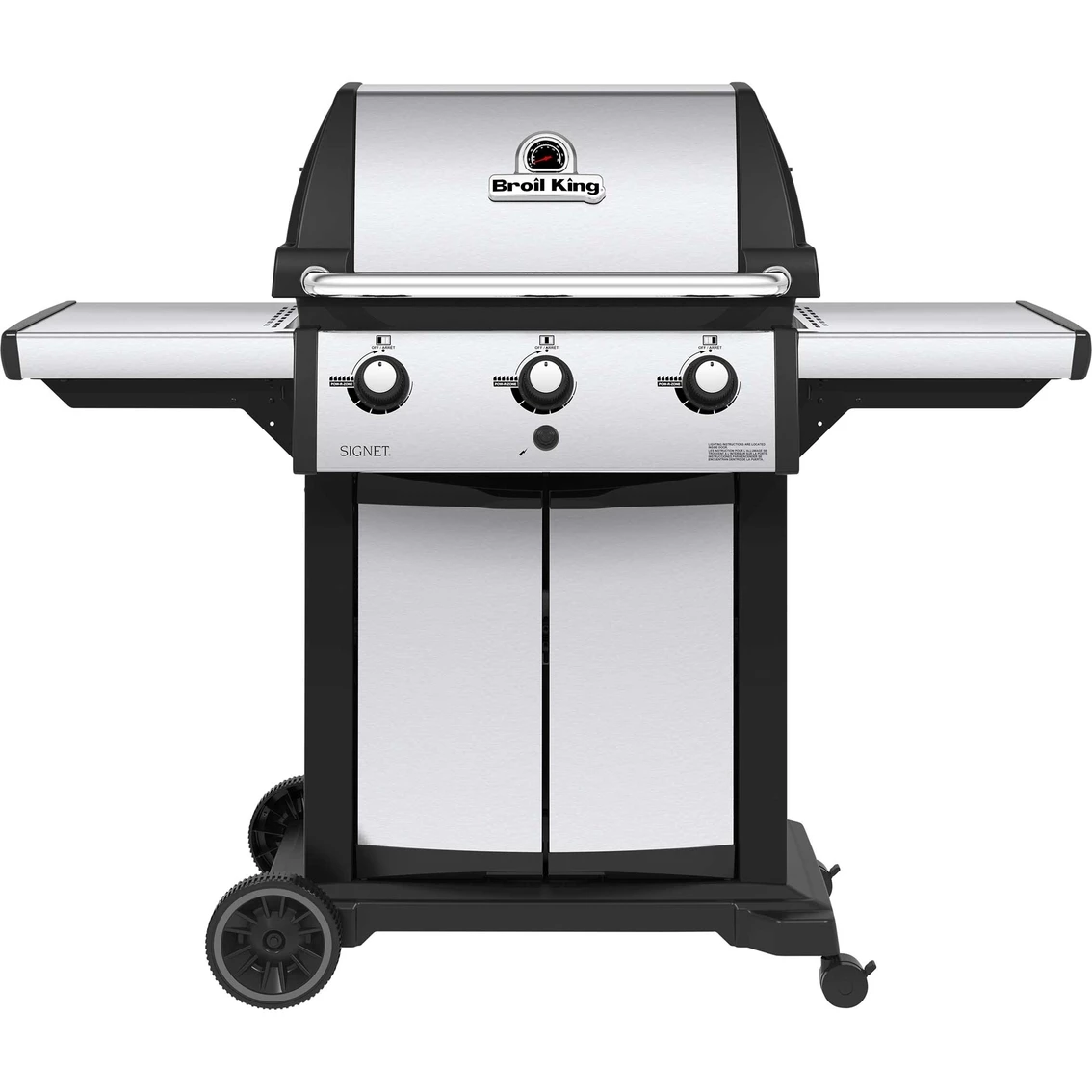 The Broil King Signet 320 features 635 sq. in. total cooking space including porcelain coated warming rack, heavy-duty cast iron cooking grids, stainless steel Flav-R-Wave cooking system, 3 stainless steel Dual-Tube burners, stainless steel drop-down side shelves and enclosed cabinet base. 40,000 BTU main burner output