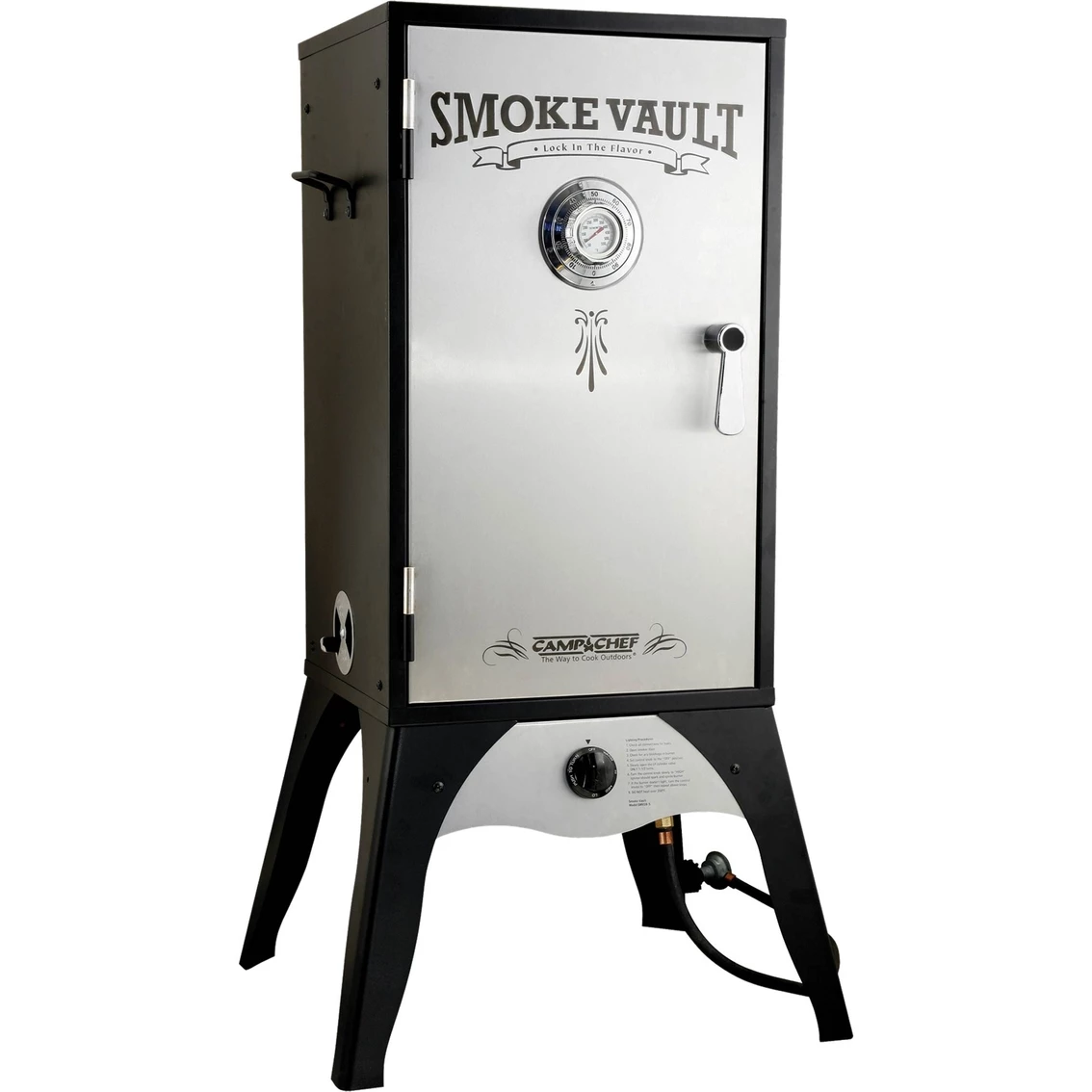 Infuse your meats with delicious mesquite, hickory or any other smoked flavor with the Camp Chef Smoke Vault 18 in. This simple system will empower your food with the most appetizing smoked tastes that can’t be experienced any other way. Use the Smoke Vault for a variety of foods from ribs, to salmon and even baked pies or breads. Fully adjustable heat-control dials, three damper valves and a door thermometer will help you control internal temperatures. Cooking temperatures can vary from 160 degrees F to 400 degrees F. The heavy-gauge steel wood chip tray and water pan create smoke and keep your meats moist. If smoking meats is a new way of cooking to you there is no need to worry; cooking tips, ideas and recipes are included with this smoker to help you get started. Use the Smoke Vault to lock in your favorite flavors. Model: SMV18S.
