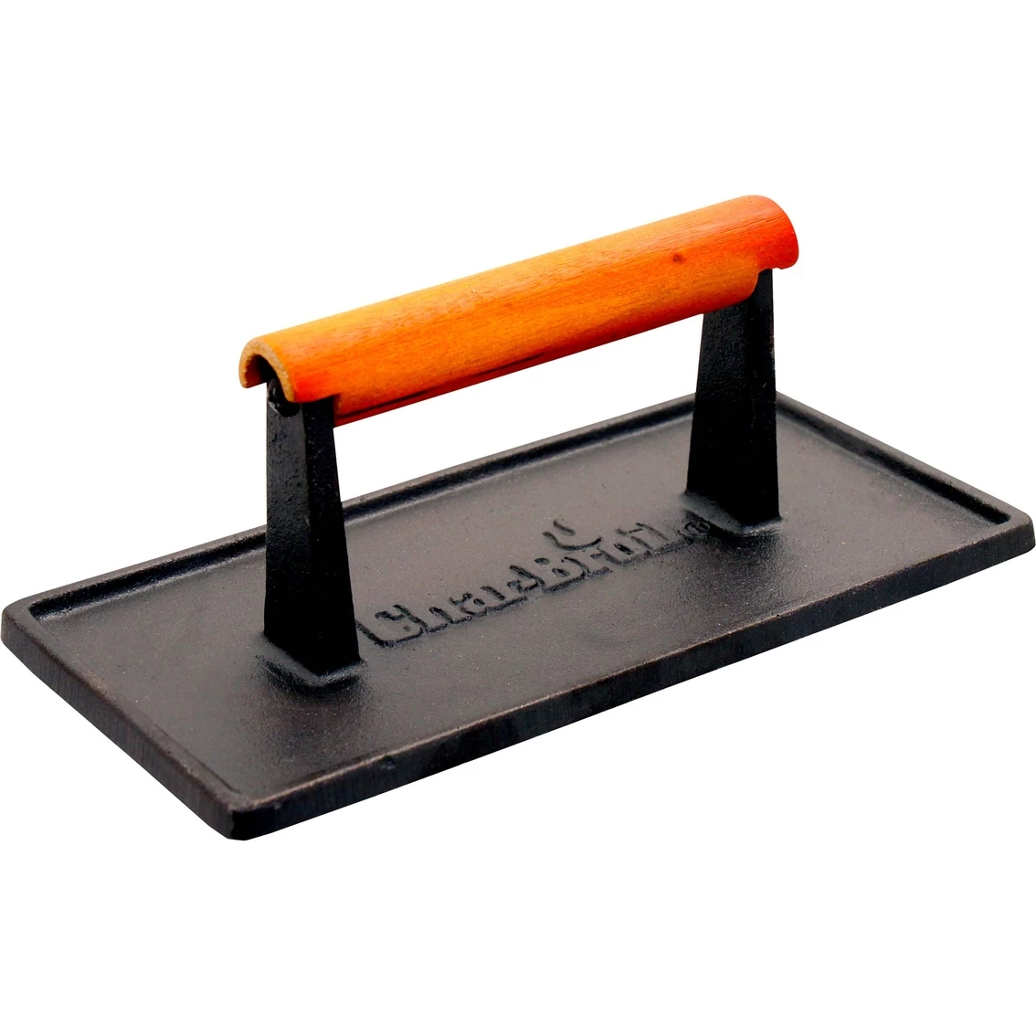 This Char-Broil heavy-duty cast iron grill press keeps your food in contact with your grill to cook evenly. It keeps the edges of your meat from curling. The press includes the grill grids for perfect grill marks on your meat and a solid wood handle. Model: 78.