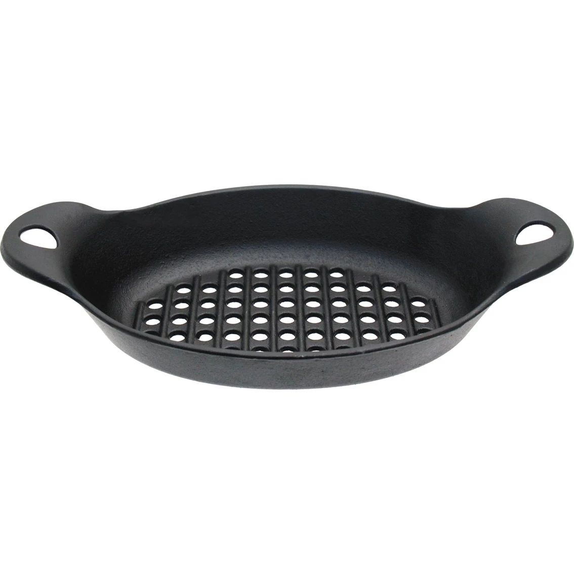 This Char-Broil Cast Iron Oval Grill Pan is perfect for vegetables, peppers, onions, shrimp and small diced meats. Cast iron distributes heat evenly to cooking surface. This 9 x 7 in. pan is great for use on the grill, stovetops or even in your oven. Model: 10080.