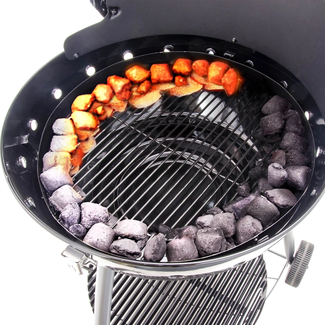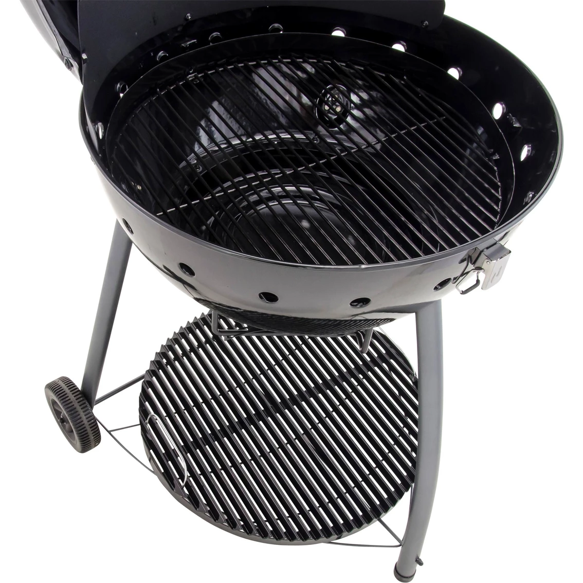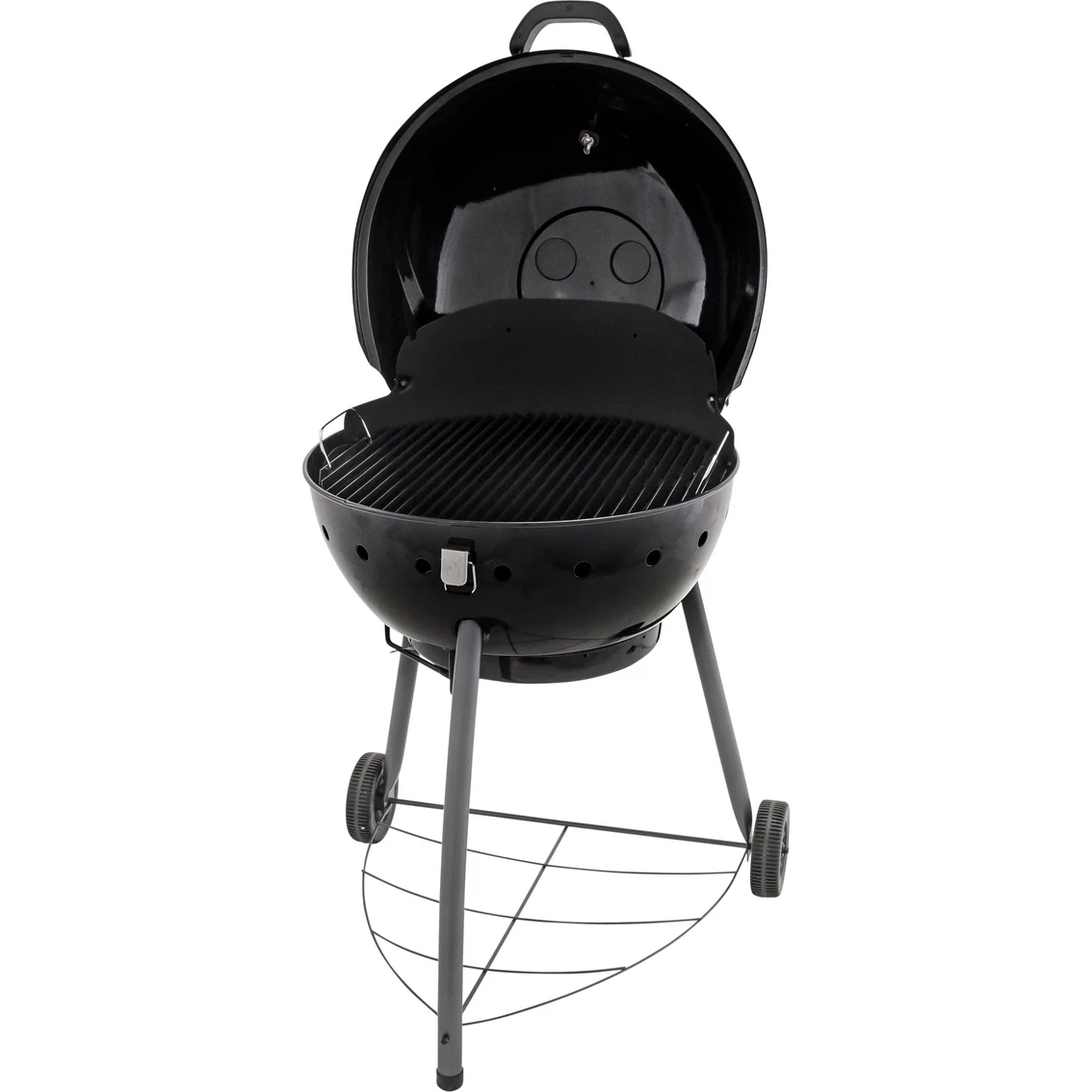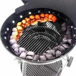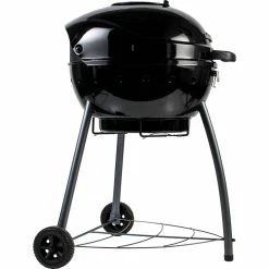 The Char-Broil Kettleman has 360 square inches of cooking space on a rust-resistant, porcelain-coated cooking grate. The no-fall-through cooking grate keeps food on top, prevents flare-ups and distributes heat evenly. The vent on the lid opens to let heat out and closes to increase cooking temperature, and for further control of the temperature and cooking, the charcoal grate is adjustable to bring the heat closer to the food or further away as needed. Two wheels offer easy mobility and a chrome-plated wire bottom shelf for stability and convenience. And the lid can be latched down to secure during transport. Also features a lid-mounted temperature gauge and a comprehensive warranty.