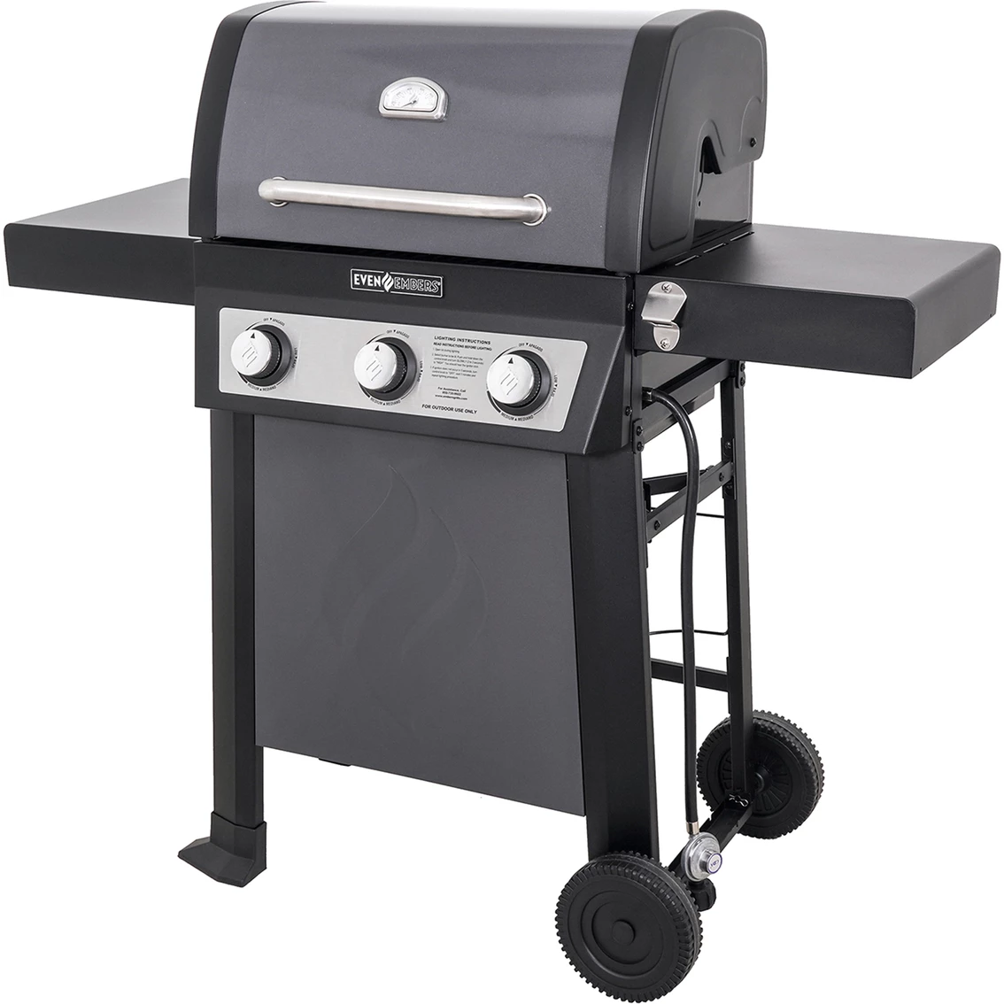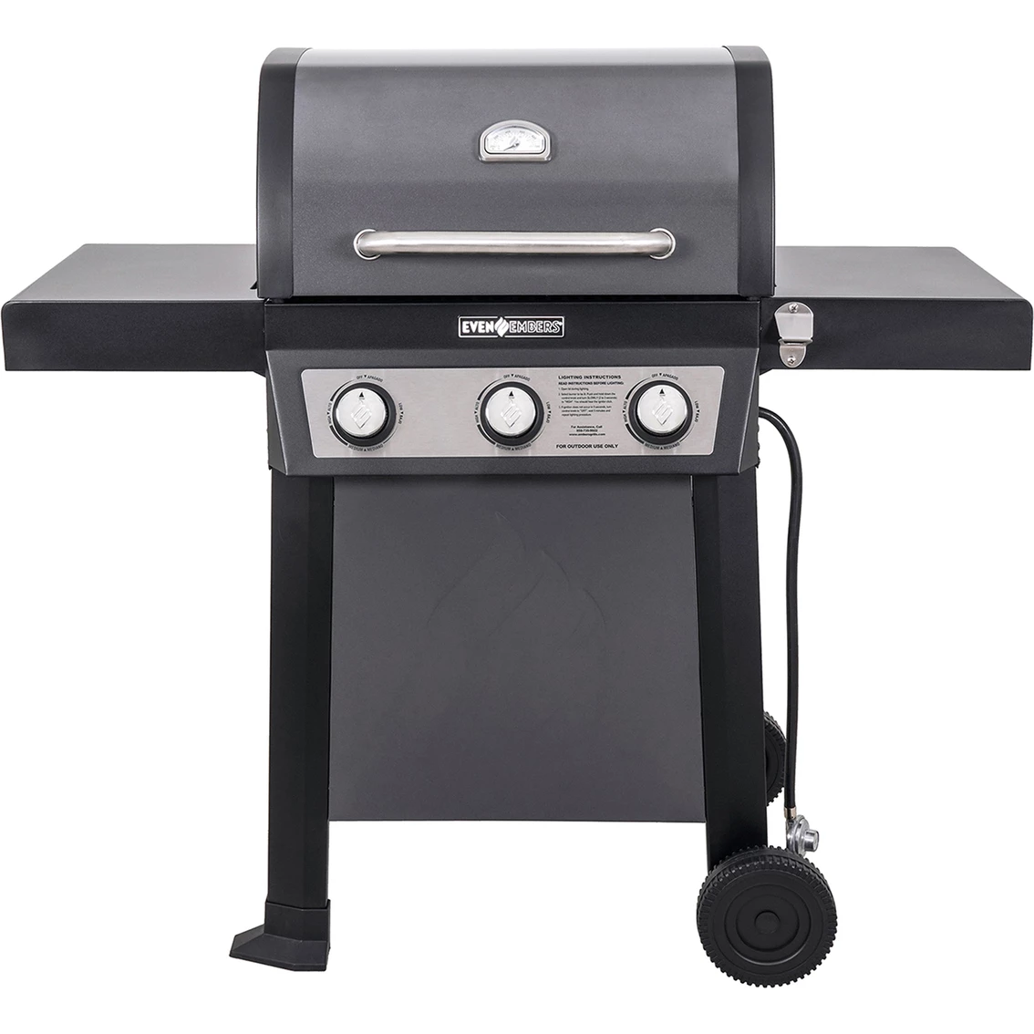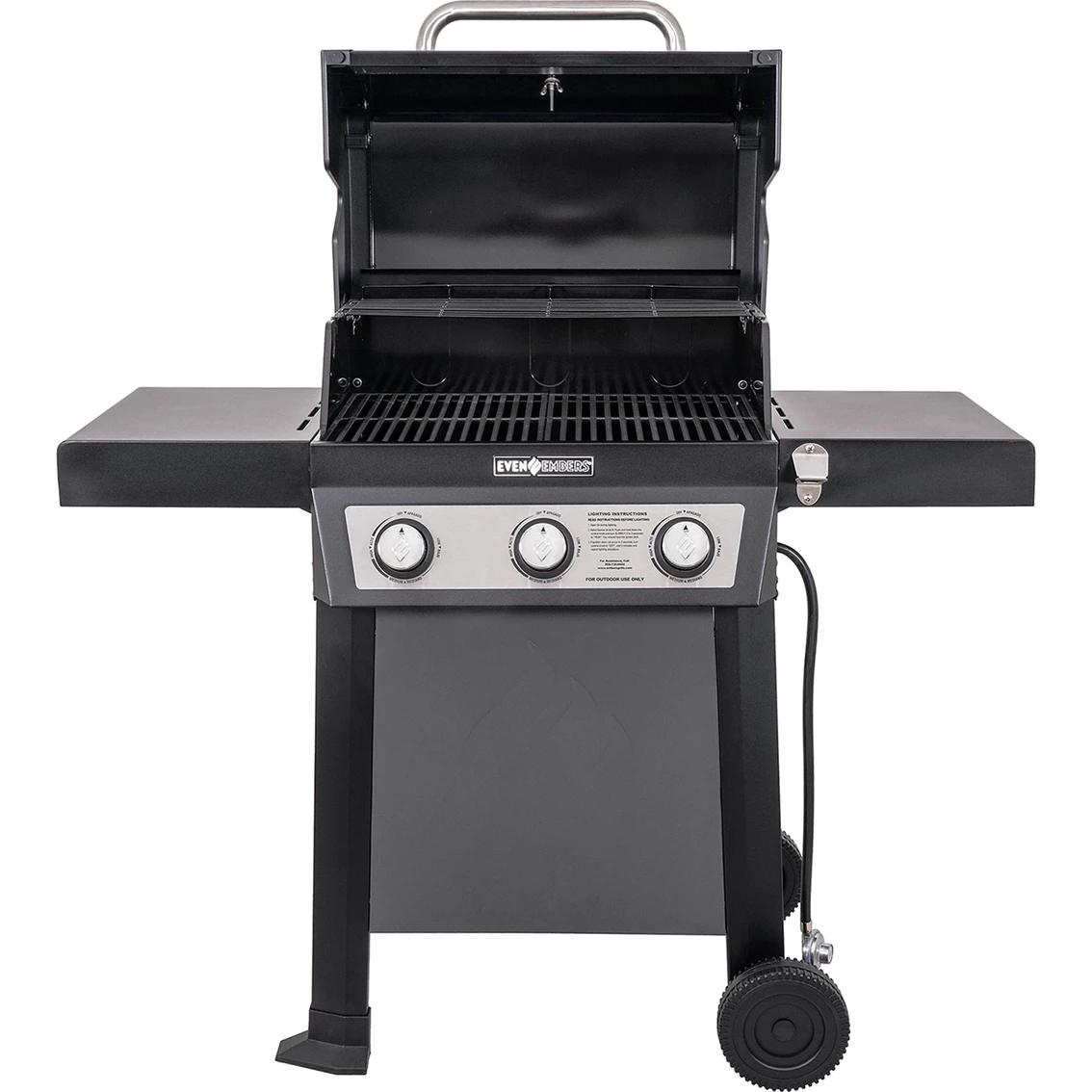 Even Embers 3 Burner Gas Grill. Experience even, consistent cooking on the Even Embers Three-Burner Gas Grill. The porcelain-coated cast-iron cooking grates and stainless-steel heat tents help vaporize foods natural juices to add flavor to your food. This grill is equipped with an easy-to-read temperature gauge, convenient bottle opener, and 542 square inches of cooking space ready for your next backyard gathering.