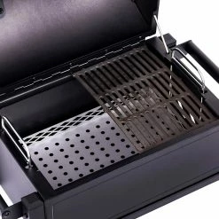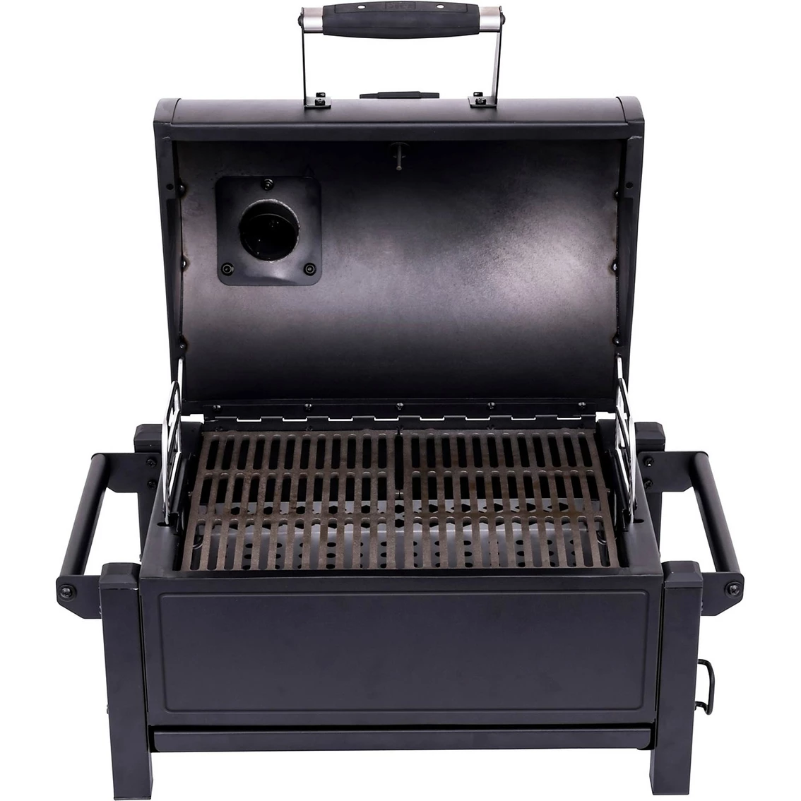The Oklahoma Joe’s Rambler Tabletop Charcoal Grill takes the best parts of a heavy-duty charcoal grill and reworks them for maximum portability. The height-adjustable charcoal tray and large air dampers give you full control of your temperature, while thick cast-iron grates deliver sizzling sears. Because The Rambler is built with convenience in mind, it has a full-size, removable ash pan for a quick and easy clean-up. Model: 19402088.