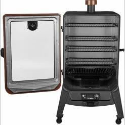 Innovation meets the outdoors with Pit Boss’ Copperhead Vertical Pellet Smoker. Never before has smoking been this versatile. The double walled insulation lets you smoke from 150 degree F to temperatures reaching 450 degree F, unlike any other smoker on the market today. The large front window eliminates the need for peek-a-boo cooking and its elevated frame makes transferring your meal from the smoker to the table a breeze. With the Pit Boss Copperhead Pellet Smoker there is no need to fret about cooking lengths — its 40 lb. plus hopper allows you to cook for up to 24 hours! Its sleek design is not only unique, it is also functional. The Pit Boss Copperhead Pellet Smoker features 1,659 square inches of porcelain coated cooking racks, locking caster wheels, an easy-to-read digital controller and a notable hammer tone copper finish. The multiple position racking system ensures you’ll have enough room to smoke anything your heart (or stomach) desires. Experience how Pit Boss is redefining the smoker industry in your own backyard! Model: PBV5P1.