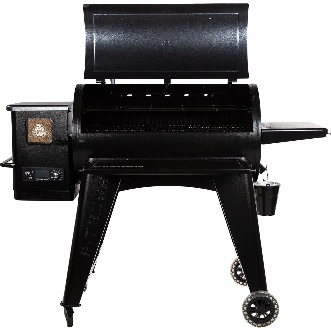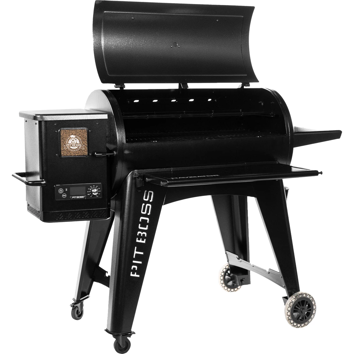The Pit Boss 1150G Navigator Series grill includes a large hopper capacity, large pellet view window, pellet door cleanout, reinforced legs, high-temperature powder coat finish, convertible front-to-bottom shelf and built-in tool hooks and locking caster wheels. Model: PB1150G.