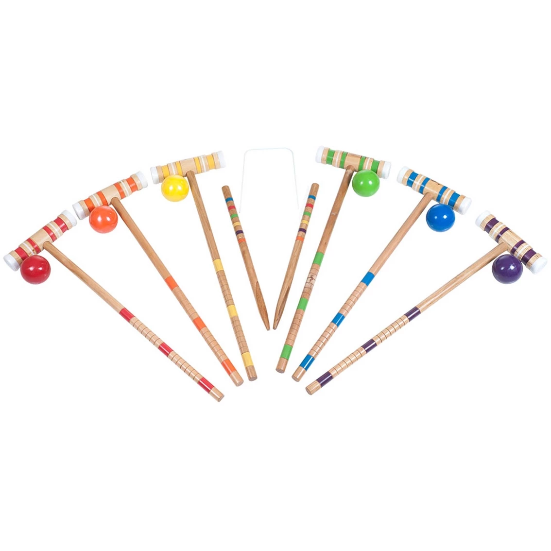| Includes | 6 solid wood mallets, 6 croquet balls, 2 stakes, 9 Wickets, 1 Carrying Case |