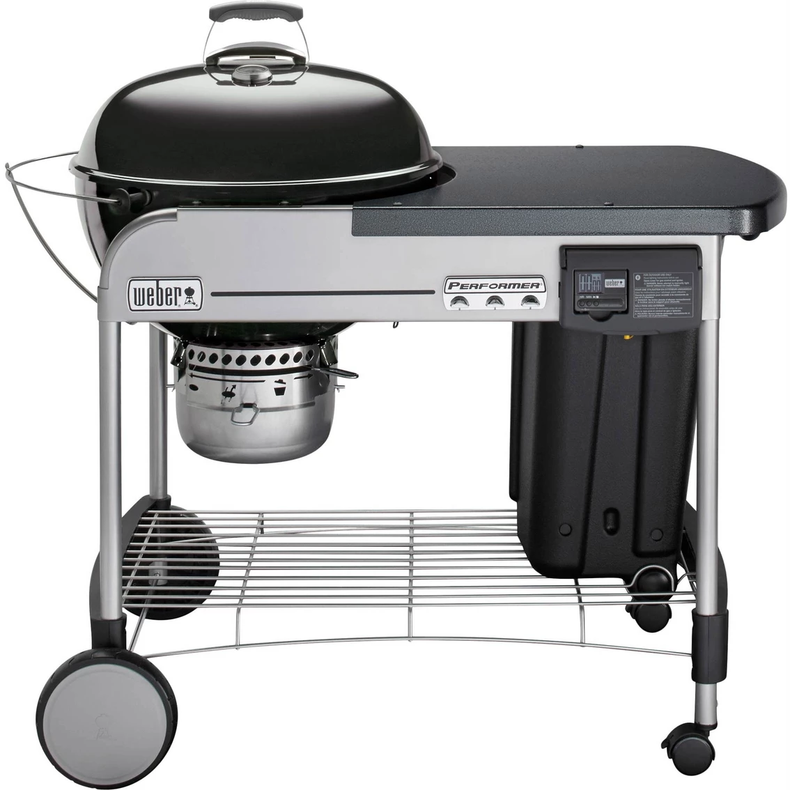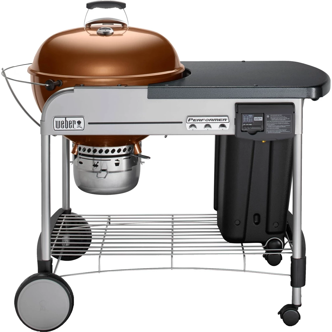 This Weber Performer Deluxe 22 in. Porcelain Enamel Kettle Charcoal Grill features an electronic gas ignition system that lights charcoal with the push of a button. Fixed side table lifts to expose convenient storage container for charcoal. Grill includes a gourmet BBQ grate and 363 sq. in. total cooking area. California Prop 65 warning.