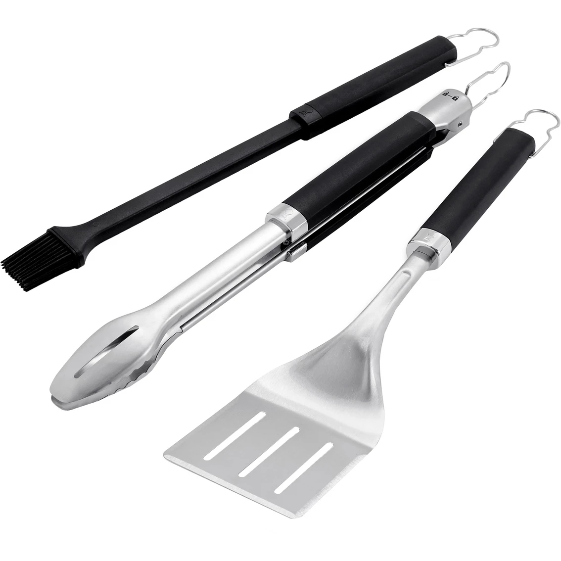 Flip burgers, turn vegetables or glaze your ribs with extra flavor. The 3-sided beveled edge spatula, hands-free locking tongs and full-size silicone basting brush in the Precision 3-Piece Grill Set from Weber are your everyday grilling essentials in one kit. All tools feature a soft-touch handle for a comfortable and secure grip.