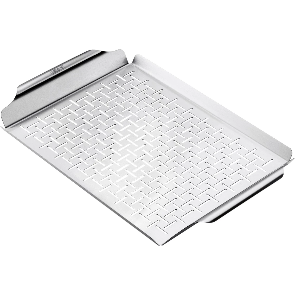 The Weber Stainless Steel Grill Pan is just the right tool for cooking pan fries on the grill. Or try it for delicate fish, vegetables and even fruit. With this Deluxe Grilling Pan, you can pan-sear shrimp and scallops in the comfort of your backyard. Saute veggies as your steak sears alongside. Use the Deluxe Grilling Pan to infuse food with the unmistakable flavor of barbecue smoke. Made of 430-grade stainless steel. Model: 6435.